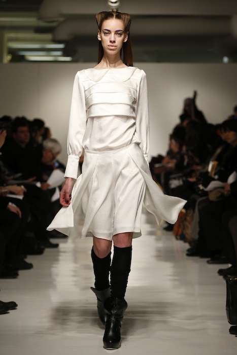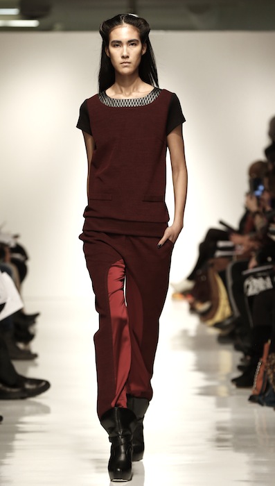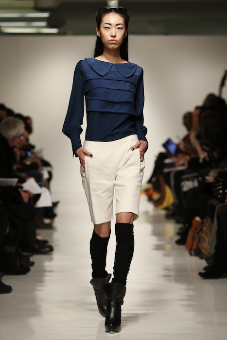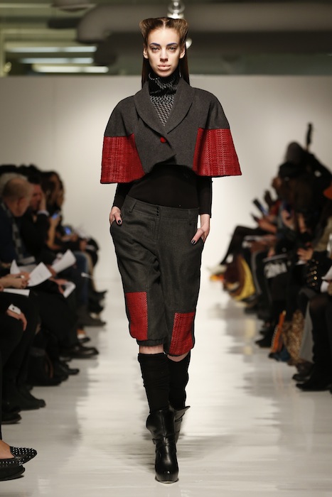 Designer Natsuko Kanno looked to her Japanese roots for inspiration from the ikusa, which means battle. For the fall 2013 collection of 4 Corners of A Circle, show started with two Japanese dancers slowly presenting their routine to an intense drum beat. Once they reached halfway down the runway, they stood on separate tables and made (a cute) exotic pose.