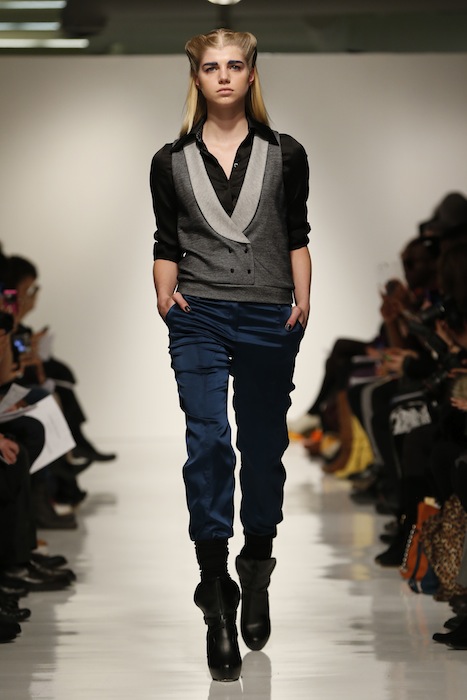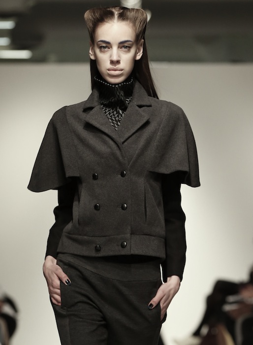 The hair for the runway was parted down the middle, pulled back, with small ‘lifts’ on the side, with thick eyebrows. There were plenty of high waisted trousers, and a few that sat just above the knee. Poncho trench coats and knee high socks seem to be the trend for fall 2013 according to Kanno. A nice move forward for the young label. fdmLOVES selects from the runway by Brigitte Segura, written by Markie Woodarek.