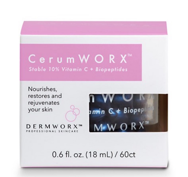 CerumWORX by DermWORX 10% Vitamin C + serum capsules for daytime. This daytime renewal formula has a blend of antioxidants, peptides and phytonutrients that reduce the appearance of fine lines and wrinkles and leave skin feeling smooth and healthy. Unlike typical serums that can oxidize after opening, this serum comes in single-use capsules that deliver maximum potency in a Vitamin C- and you guessed, easy to transport without spillage. Available online and at dermatologists