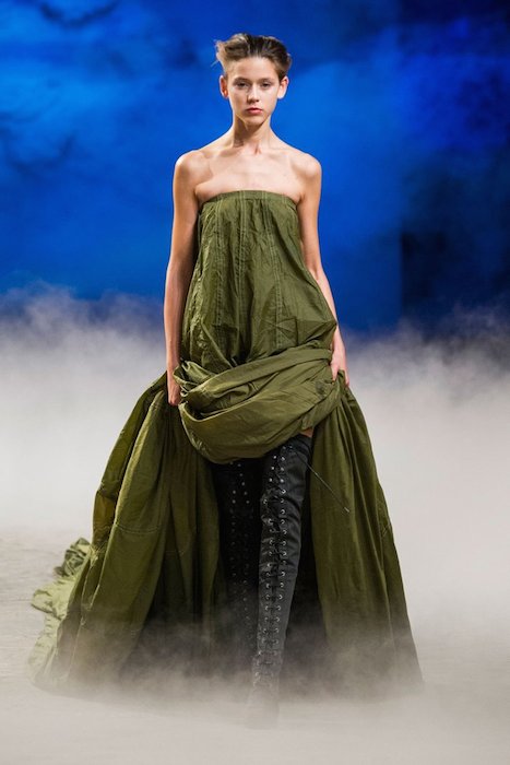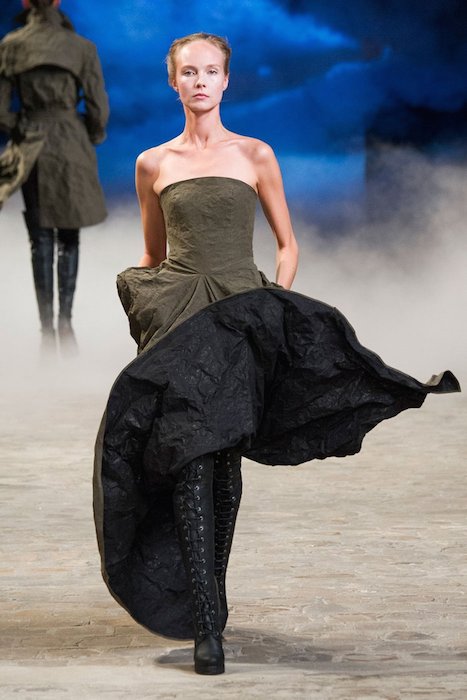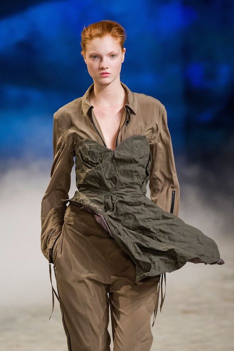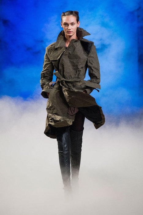 Alot of attitude flowed on the runway in tones of olive, charcoal, brown, khaki, and black. Sculpted silhouettes were scrunched in fabrication to give a more authentic utilitarian look.