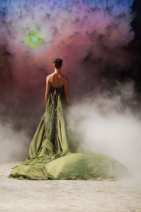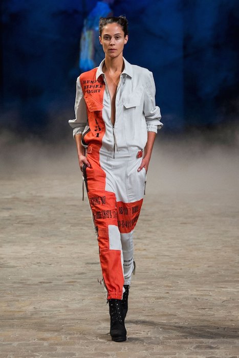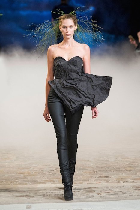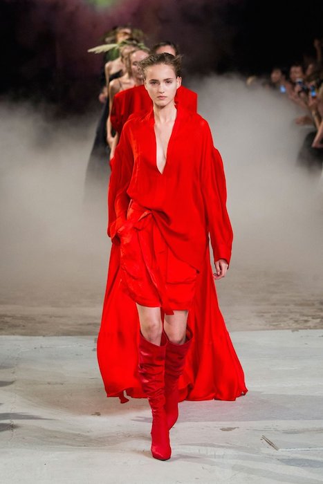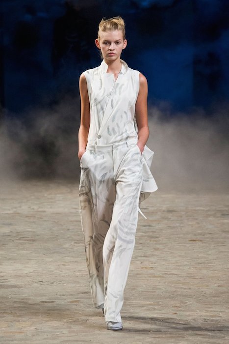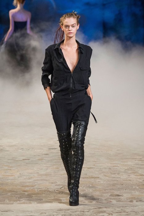 Army gear met high fashion at A.F. Vandevorst SS 2015 during PFW. The utilitarian wear was serious + powerful. The show matched the theme with thick mist rolling over the runway and appropriately colored lighting. Favorite looks included a variety pack of jumpsuits, and pieces accessorized with lace-up over the knee boots.