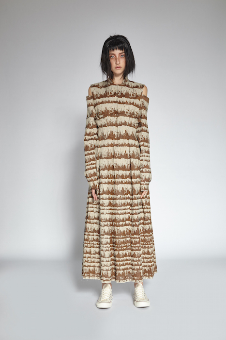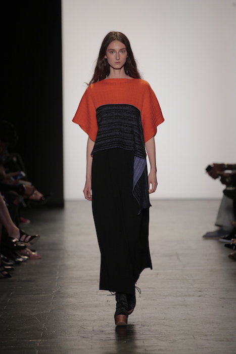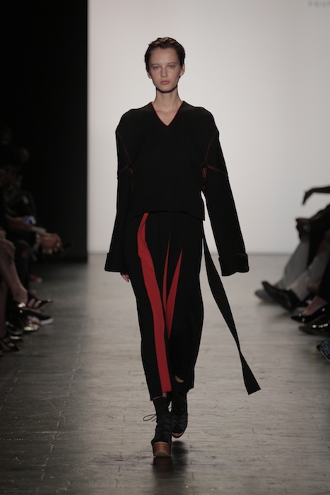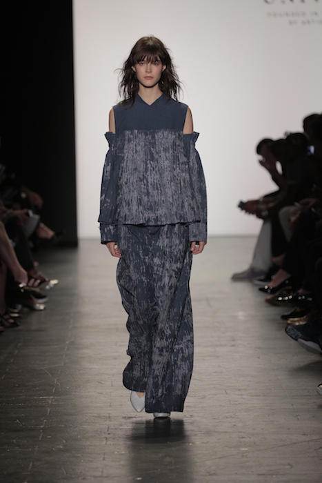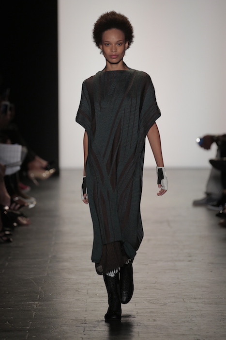 Placement was the focal point of the Anita Szu-Yi Chen knitwear collection. Her ability to construct clothing that had organized folds, angular shapes and movement is impressive. Her oversized designs featured reversible patterns to provide a versatile experience.