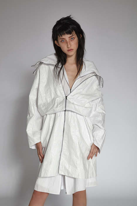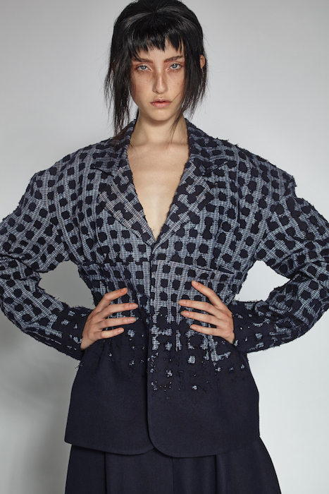 Dora Li’s inspiration came from the attire of child workers in the 30’s. The oversized silhouettes and tarnished fabrics, represent her muse well. The fabric selection were made by Carly Dean who collaborated with Dora on this collection. She was able to create layered fabrics with a gritty texture to further play out Dora’s vision.