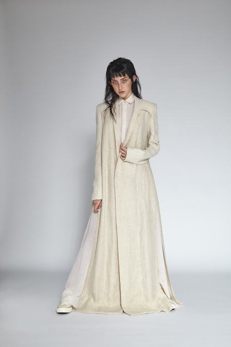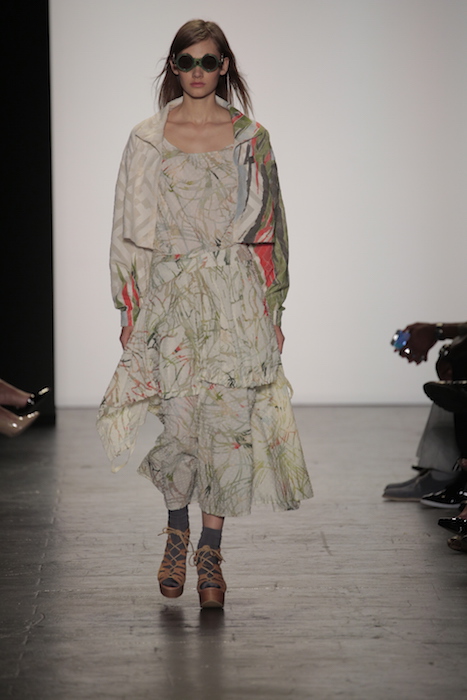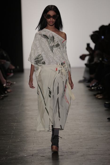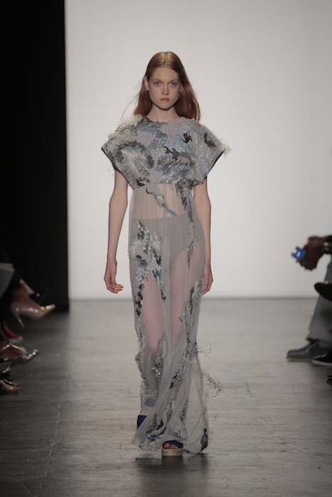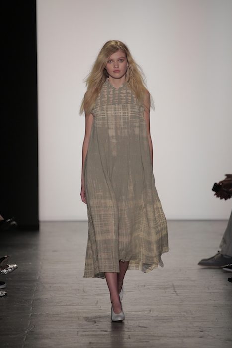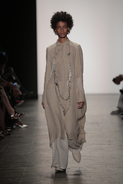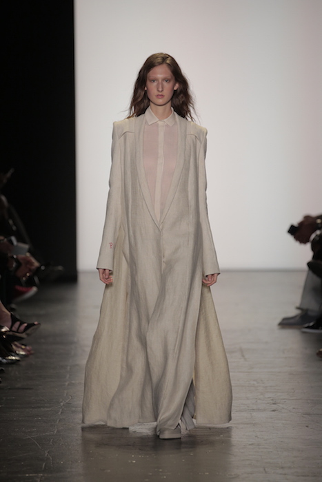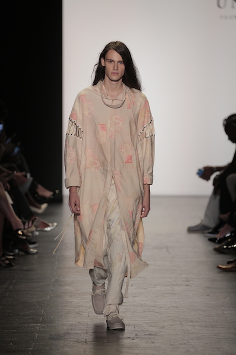 The aesthetic of the Lindsey Trueman collection worked in subtle pales nudes with a rugged message. The tailored garments presented the long history of her family’s Native American background onto its grain sack fabric. Longline pieces worked in unison with the flesh tone color scheme.