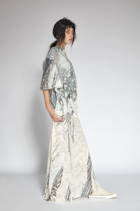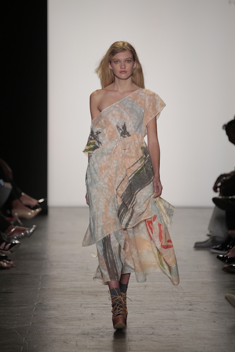 The textile designs of Taiwanese student, Yi Ru Chen, express the delicacy of a calm sea. The soft palettes and fluid motion of all the garments brought tranquility to the runway. Asymmetrical cuts and cinched waists enhanced the silhouettes on all the garments as well. Chinese born Jing Qian collaborated with Yi Ru for this collection and contributed the artistic prints to these organic threads. Soft brush strokes and abstract designs were hand painted onto these eco-friendly fabrics.