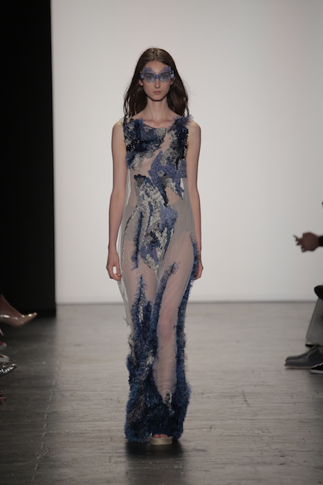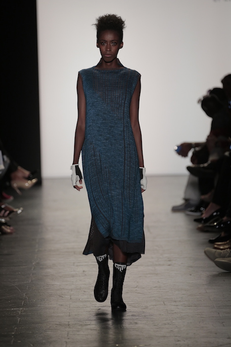The knitwear designs by Natalya Sheveleva Robinson required every stitch to tell it’s own story with the use of color and direction. The geometric designs of her sweater dresses, transitioned effortlessly in collaboration with her color scheme. Deep blues faded into icy greys expressing the polar opposites of the spectrum.