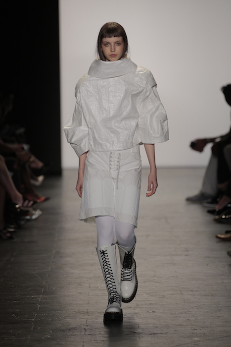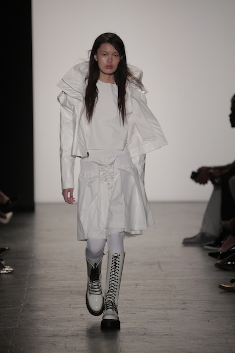 South Korean GeuMi Lee, displayed futurism and sporty style with this season’s collection. Lace up bottoms and padding fused with customary martial arts garb to create both a functioning aspect to the line.