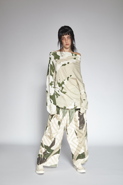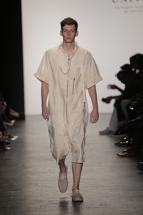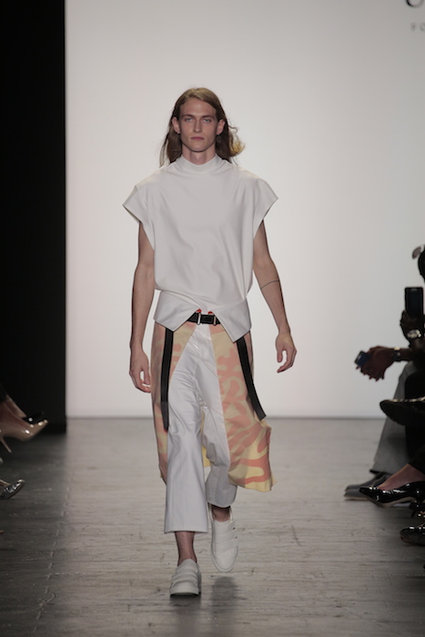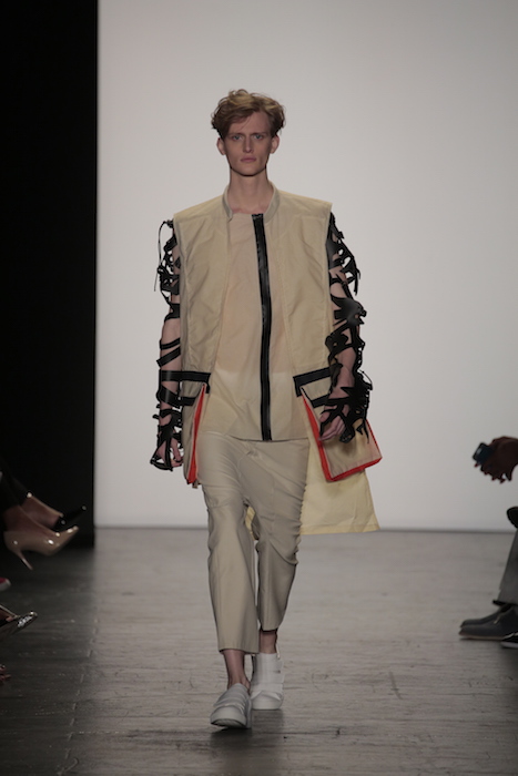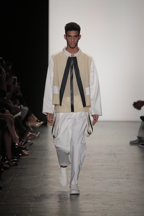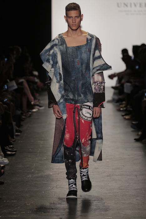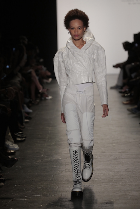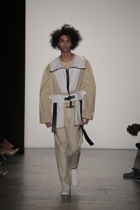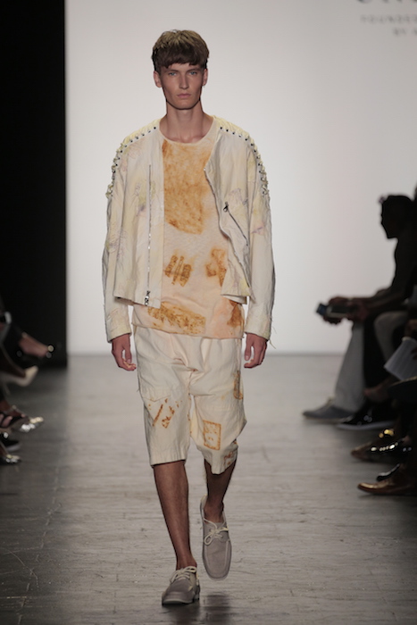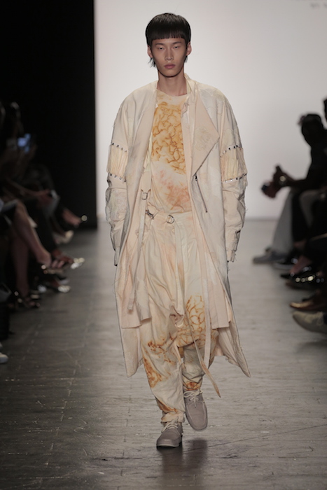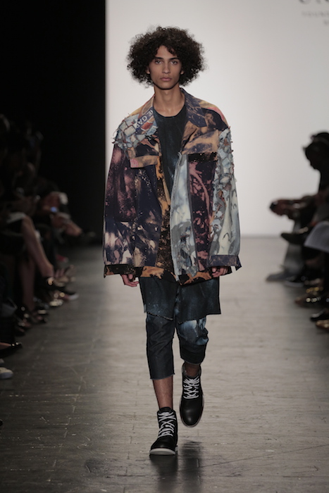 Innovative techniques in Brandon Kee’s work, incorporating rust on his garments gave off a worn in vibe to his baggy pieces. Aviation style jumpsuits were also featured with heavy distressing. He was able to flip a uniform into an urban flare ensemble.