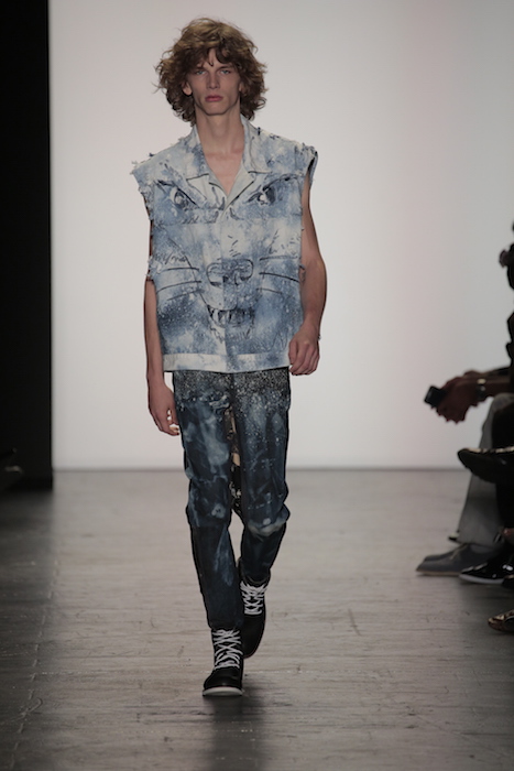 Ben Ellis menswear brought the noise. Patchwork denim and heavy jersey material was the base of majority of the line. He further used bleach and the depictions of strong predators of the animal world in a roaring homage to his Alaskan homeland. These rough around the edge design surely had a deeper story to tell.