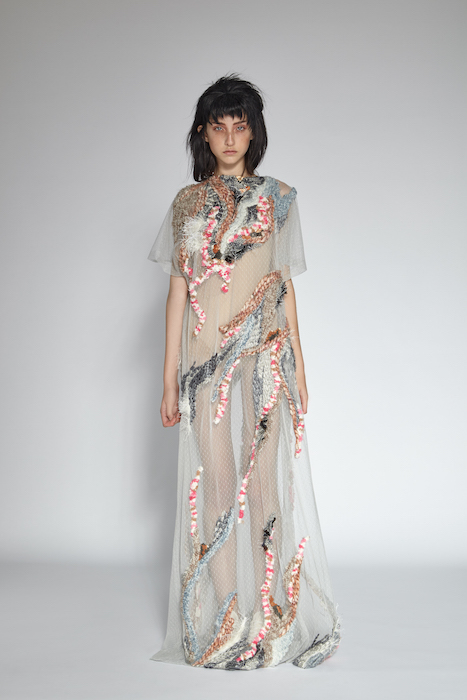 Nina Nguyen is a Vietnamese designer who based this collection off of the temperament of sea coral. The designs lay on top of a sheer base and displayed pastel colors placed delicately across the garments. They exhibited a vigorous femininity shown throughout the tedious beadwork and frayed edges.