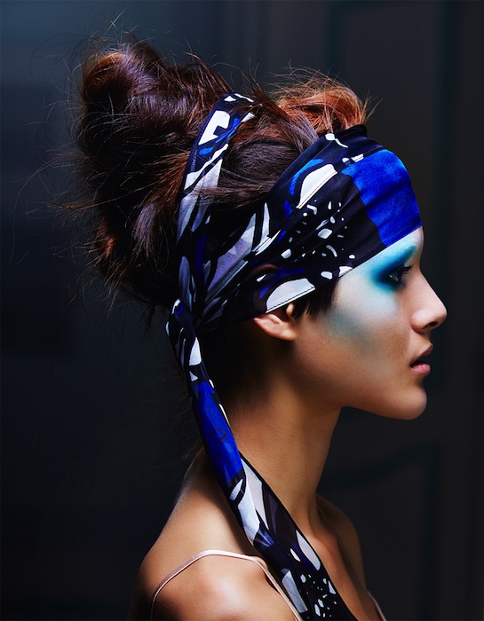 Luyu embodies spirited adornment, layered or wrapped scarves and shawls wow in vibrant shades grounded with black. With patterns an the panels of fine fabric, movement is directed with lines or stripe. We totally dig the richly colored blues.