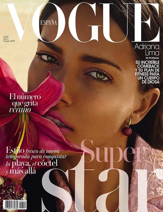 Editorial: Adriana Lima is a bronzed goddess, photographed by Miguel Reveriego for Vogue Spain, May 2014. Makeup Artist Serge Hodonou, editor Belen Antolin. She is sizzling, even in pink… and is sporting our favorite new flavor of Ashish pink sequined top. More Adriana Lima here.