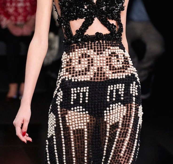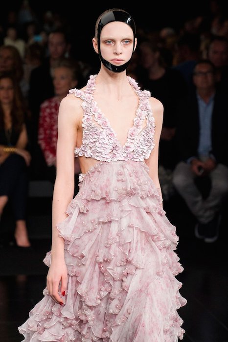 Orientalism was taken to a more abstract level though Burton’s use of geometric design and cut outs. Full skirts were petaled softly in layers and layers of pretty pink and ecru, a softer and more feminine look to the show. Kimono-inspired dresses were where traditionalism was made more contemporary. Though Kimonos are used to cover up the body in Japanese culture, Burton chose to open up the front and cut out the back. This left more skin to bare and was a different perspective to traditional garb, in which the designer didn’t want to be restrictive but instead, more empowering.