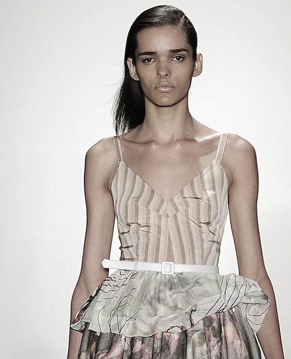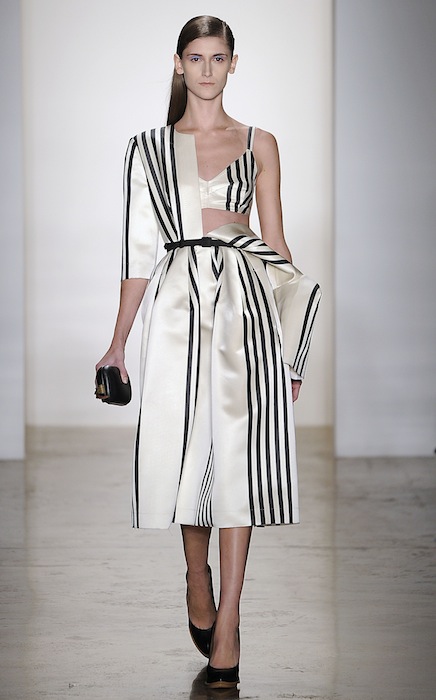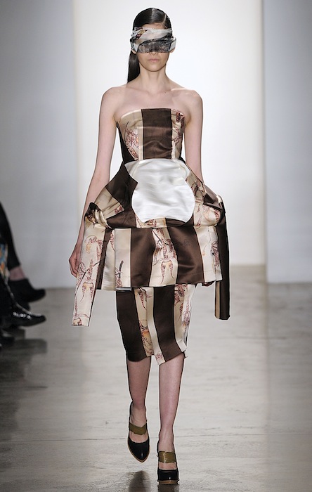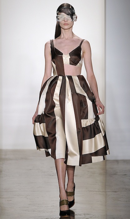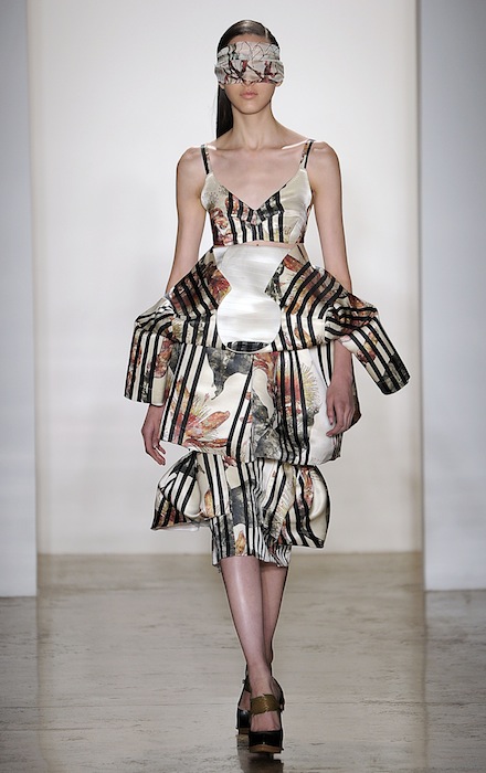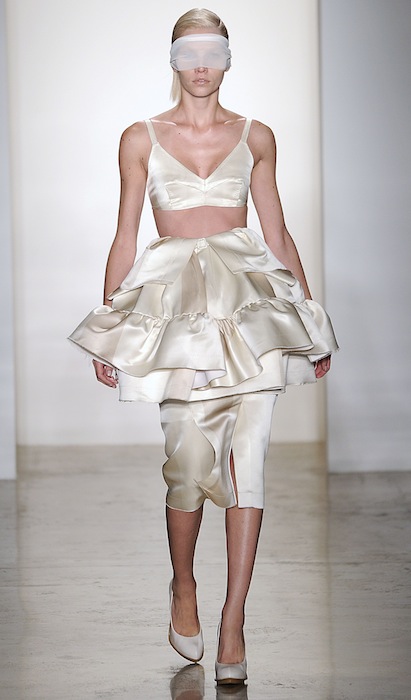 One of our faves was the ivory and black striped silk satin dress belted at the waist with an undone side made to look peeled. As the collection progressed, looks had tops folded over as faux peplums to give the notion of a (dying) flower in a Herchcovitch’s artistic point of view. Model faces were wrapped in extra fabric towards the end adding a slight theatrical touch but still romantically femme. A definite burst moment was the icy sleek blonde model in the ivory satin number with an abundance of ruffles on the waistline and white sheer fabric over her radiant muted face.. so drama.