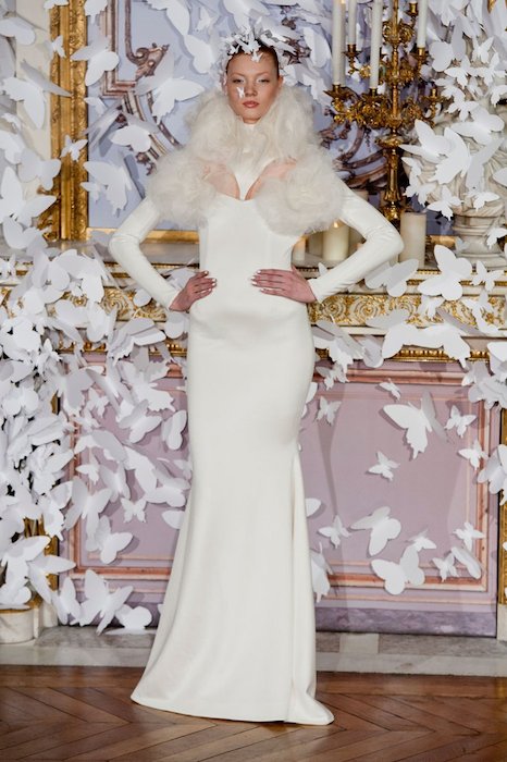 Sometimes all you can really say about a line is ‘wow.’ That’s the immediate reaction when gazing at the Alexis Mabille Haute Couture Spring 2014 collection. With Greco-Roman influences that harken back to grape leaves and draping, there’s no doubt this designer’s muse is nothing short of a goddess. Gorgeous white satin, blue and shimmering gold are really something spectacular. The ethereal vibe is amplified with delicate white butterflies on the background and on the models’ faces. Quite transfixing.