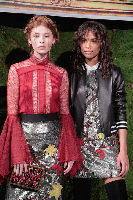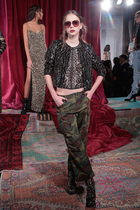 Styled fun + sparkled. Alice and Olivia gives us a mash-up of wearable cool for fall 2017. Sequins come in handy every day, mixed with camo pants, skinny jeans, and sometimes just a standout little dress. Faves include fluid sequins in silver and gold please!