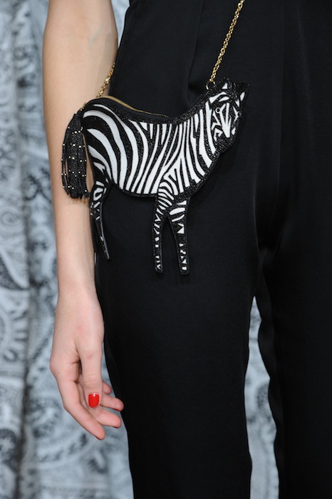 From the footwear- with its shaded moody faces-to the bags-such as a sweet chained miniature zebra bag-to the laced shoulders adoring a button-down, the Alice + Olivia girl is still smart, but with a sassy touch. In the Fall Winter collection, swirls of color added dimension to their deeper counterparts. A brocaded coat appeared iridescent in its floral fineness when put beside a deep olive wide-legged trouser.