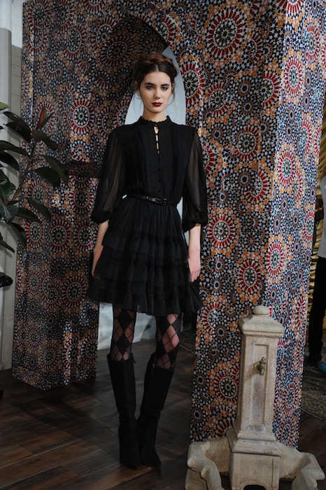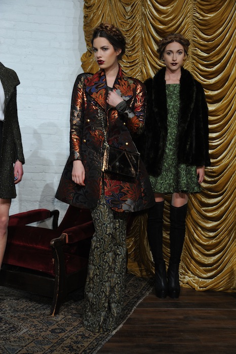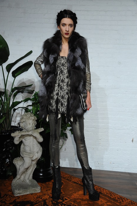 Graphic prints walked away from typical minimalistic references, rather accentuating the more classic, layered fabrics such as furs, lace, lazer-cut leathers, and burned-out velvet. Think a crimson argyle sweater that was less prep and more punk when paired with the black-lined shawl and ankle boots. Bendet knows how to transition the more decadent fabrics into the nightlife, such as pairing full furs with metallic silver leggings. Or by trimming an elongated vest with thick embroidery, but sustaining the high-low silhouette when over a leg-baring short shift dress and slim knee-high boots. Shine allowed the pieces to enter the nightlife, whether it’s a bejeweled clutch, a shimmering lapeled jacket, or a gold vest. A turn into evening wear gowns was a lot less sweet, and much more seductress- but the transition was very seamless by shaping them in lace. No wonder more familiar faces like Maggie Grace,Julie Henderson, Angela Simmons, Becka Diamond, Cory Kennedy, Ellen Wong, Nell Diamond, Catt Sadler, Chloe Bridges, Hesta Prynn, Victoria Justice, Anna Chlumsky, Zoe Lister Jones, Sarah Ramos, and Nichole Galicia came to check out the new alice + olivia goodies in store for fall.