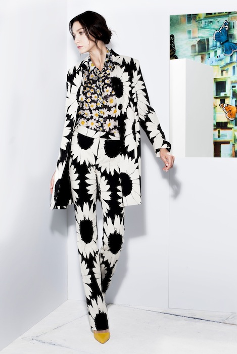 Print is bold and alive in wild botanical-style prints and bursted polka dots. Try to mix prints for a spirited effect that has a personal touch, either in suit looks or separates. Novelty pieces appear in a deceiving shift dress and a sequin-encrusted sheath with figural designs that resemble an assortment of collected souvenir badges. An enhanced photoprint depicting the famous cliffside houses of Italy’s Cinque Terre invokes Bendet’s love of travel.