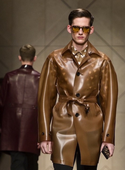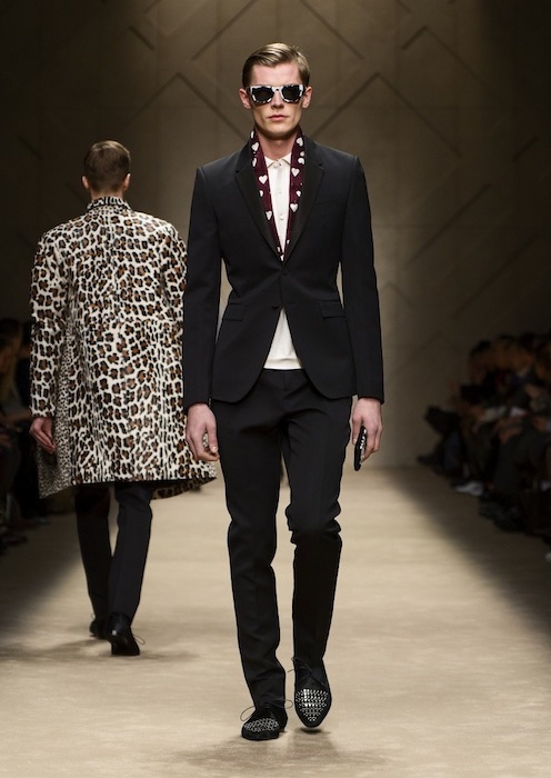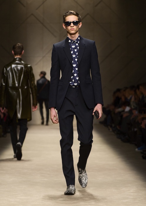 The Burberry Prorsum mens fall 2013 collection features traditional outerwear and playful cool weather accouterments among other layerable pieces. Of course trench coats and tailored jackets topped the list – interesting styles of duffle coats, donkey jackets, and Chesterfields added dimension. Fabrics ranged from customary Gabardine to a softer side with velvet and cashmere, while colors were rich in reds, greens, and purple against khaki shades. More than usual of fun with prints and patterns, especially the various heart incarnations added some charismatic elements, as did accessories like the Boston bag, Studded winklepicker shoes, animal print sunglasses, and the Britain watch. Properly Prorsum — the line was showcased to the beat of British musicians Amy Macdonald and Jake Bugg.