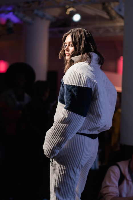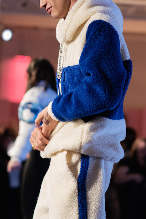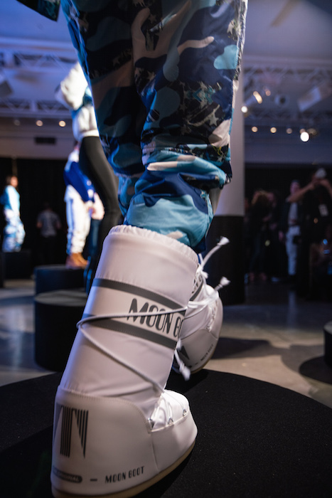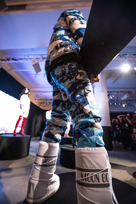 Models dancing to the beat of the club-like sound were flaunting blue camo patterned parkas, puffy jackets and cargo and skater looks. Pops of ski-bunny inspired pieces included jumpsuits, leather looks, camo pants and casual warm gear for both guys and girls. Fun vibe, fun times..