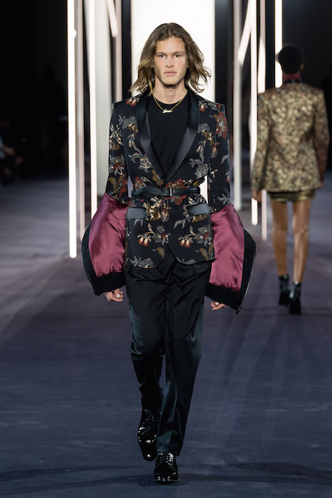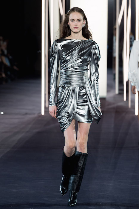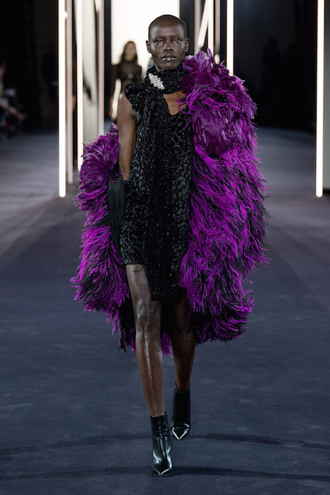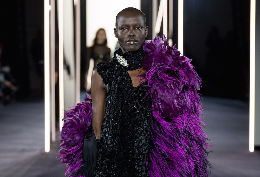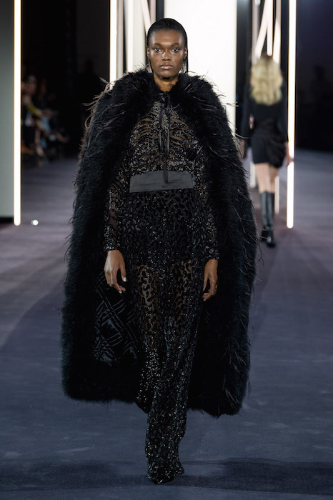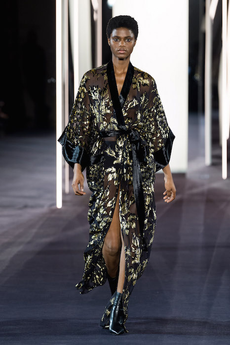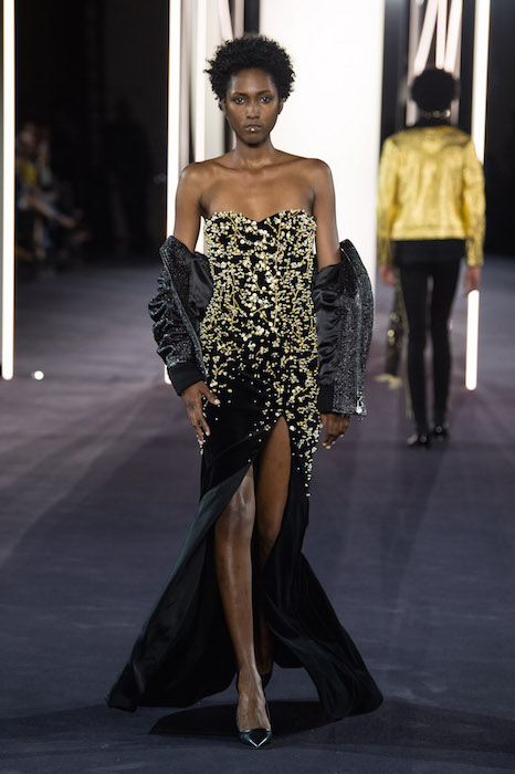 A fusion of cultures and eras at AZZARO SS18 COUTURE during Paris Couture Fashion Week. Creative Director Maxime Simoëns offers a vision of evanescent femininity through a sparkled collection. Gold and silver lamé pieces are fluid and draped, offsetting the feathered voluminous attitude.