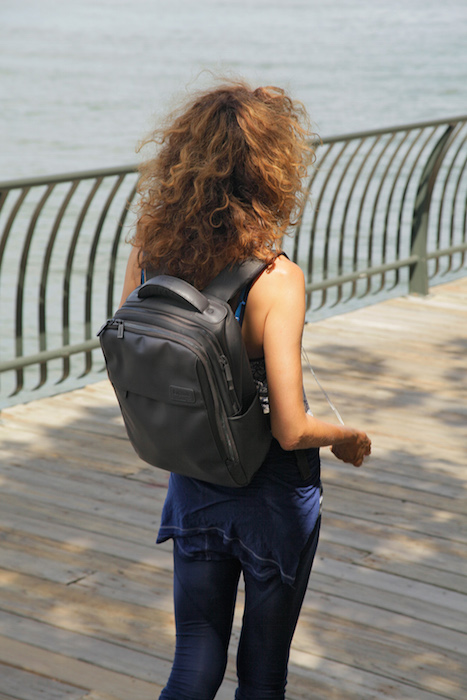 So I tried out this Frenchie bag by Lipault, figuring the detailed euro’s would take everything into consideration in creating a practical design. Well, they did! The ‘Plume’ 15″ design itself is modern and not frumpy… and that’s a plus. The very attractive handle on the top of the bag can also be used to carry it like a purse when you get to a destination. And… look at me, gold headphones, gadget on back + hands free to take pics with my phone- yay!