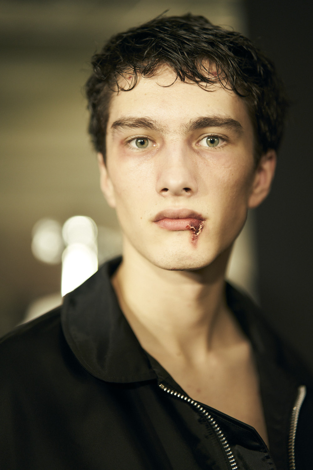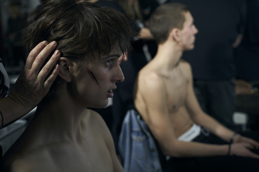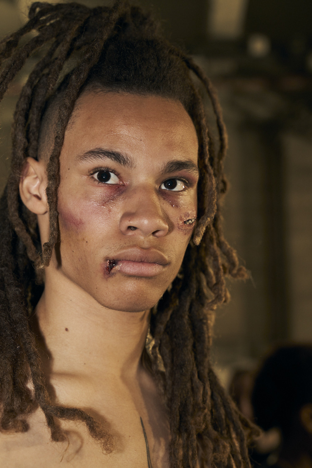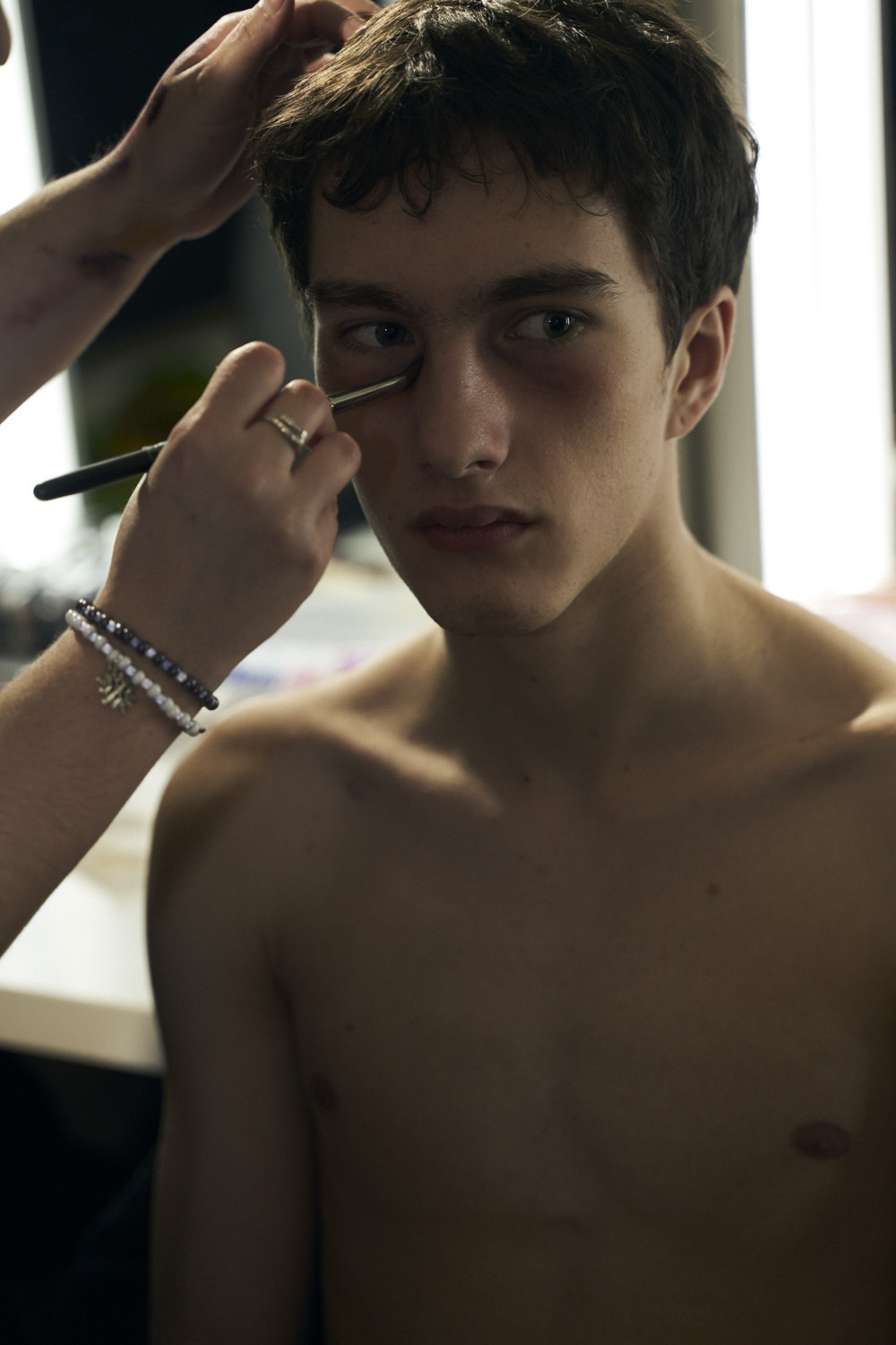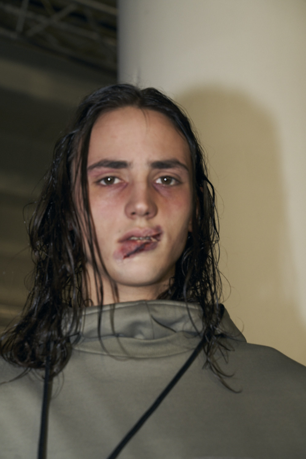 A glimpse of the very few quiet moments behind the scenes in Paris during the Fashion Week mens fall 2020 collections. Capturing the moody moments and expressive eyes, photographer Isabelle Grosse shares a glimpse of the models shot backstage for FashionDailyMag during the grooming + makeup at the Tatras x RiotHill FW 2020 show. Contrasting the rough-around-the-edges and ‘beat up’ tough guy face makeup, the models mood up a pretty sweet face, n’est-ce pas?