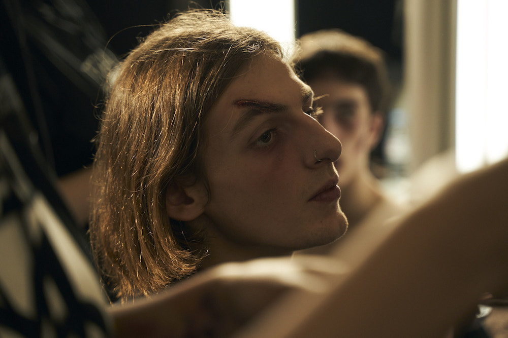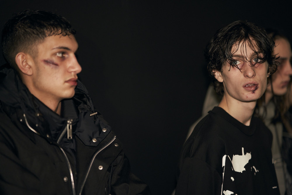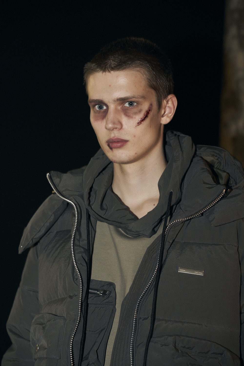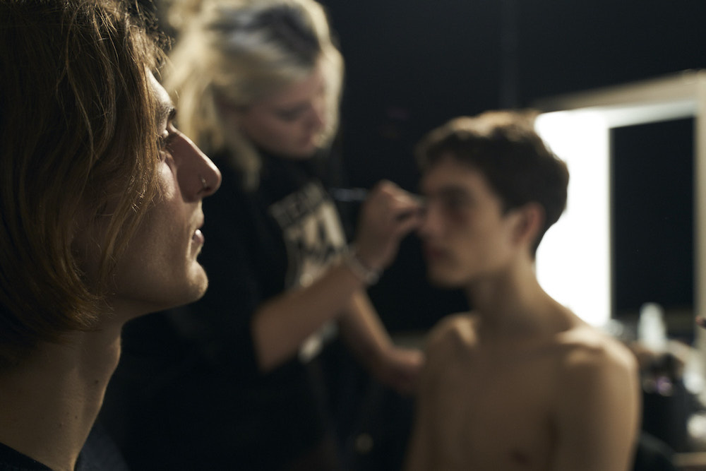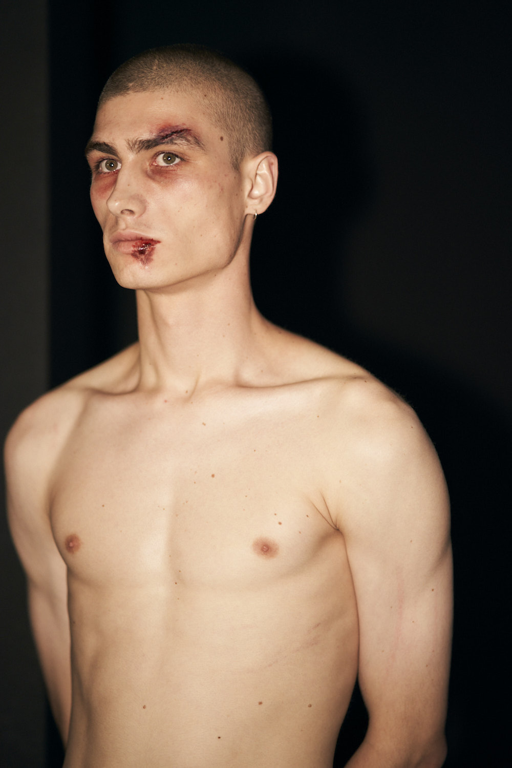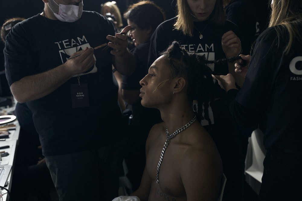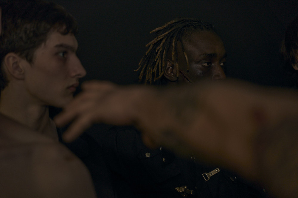 A glimpse of the very few quiet moments behind the scenes in Paris during the Fashion Week mens fall 2020 collections. Capturing the moody moments and expressive eyes, photographer Isabelle Grosse shares a glimpse of the models shot backstage for FashionDailyMag during the grooming + makeup at the Tatras x RiotHill FW 2020 show. Contrasting the rough-around-the-edges and ‘beat up’ tough guy face makeup, the models mood up a pretty sweet face, n’est-ce pas?