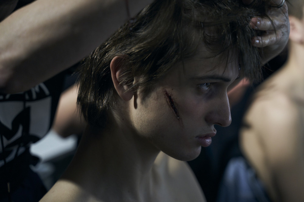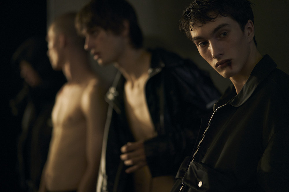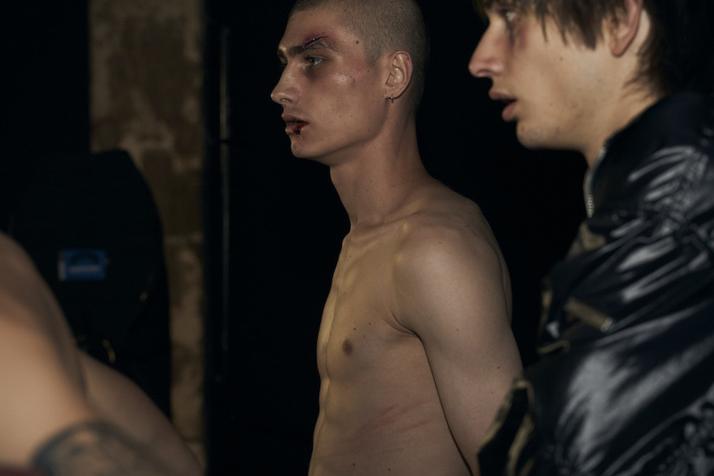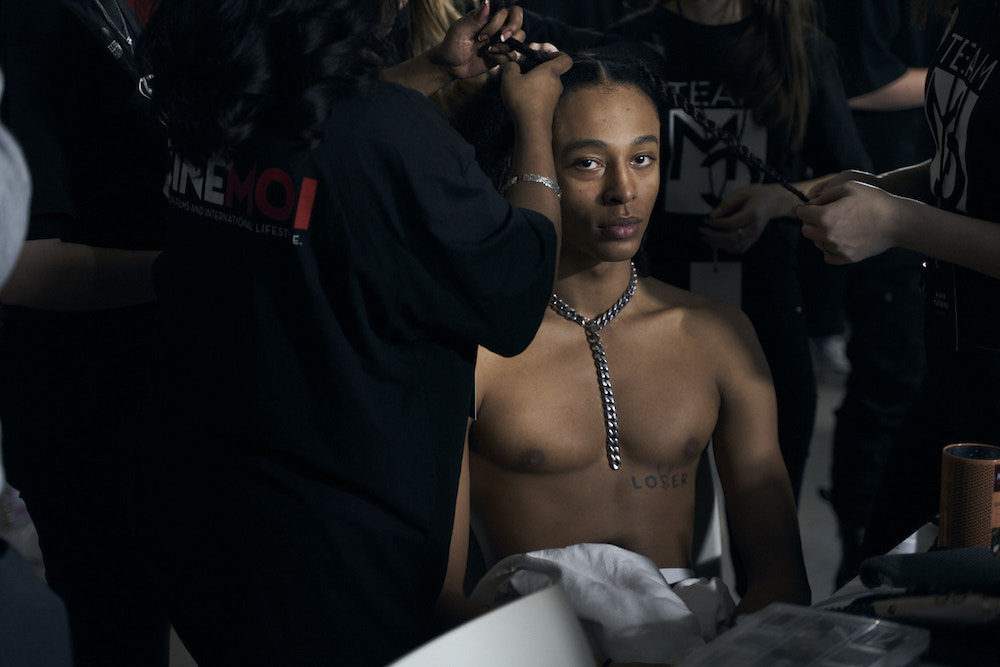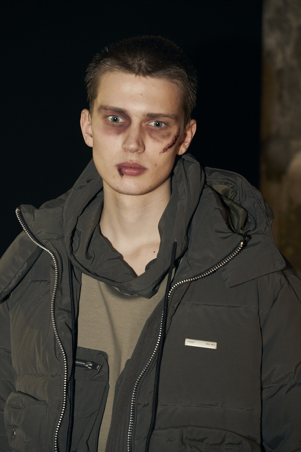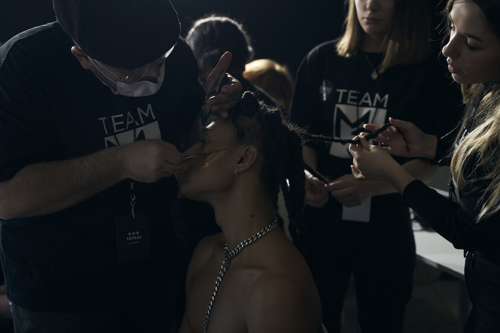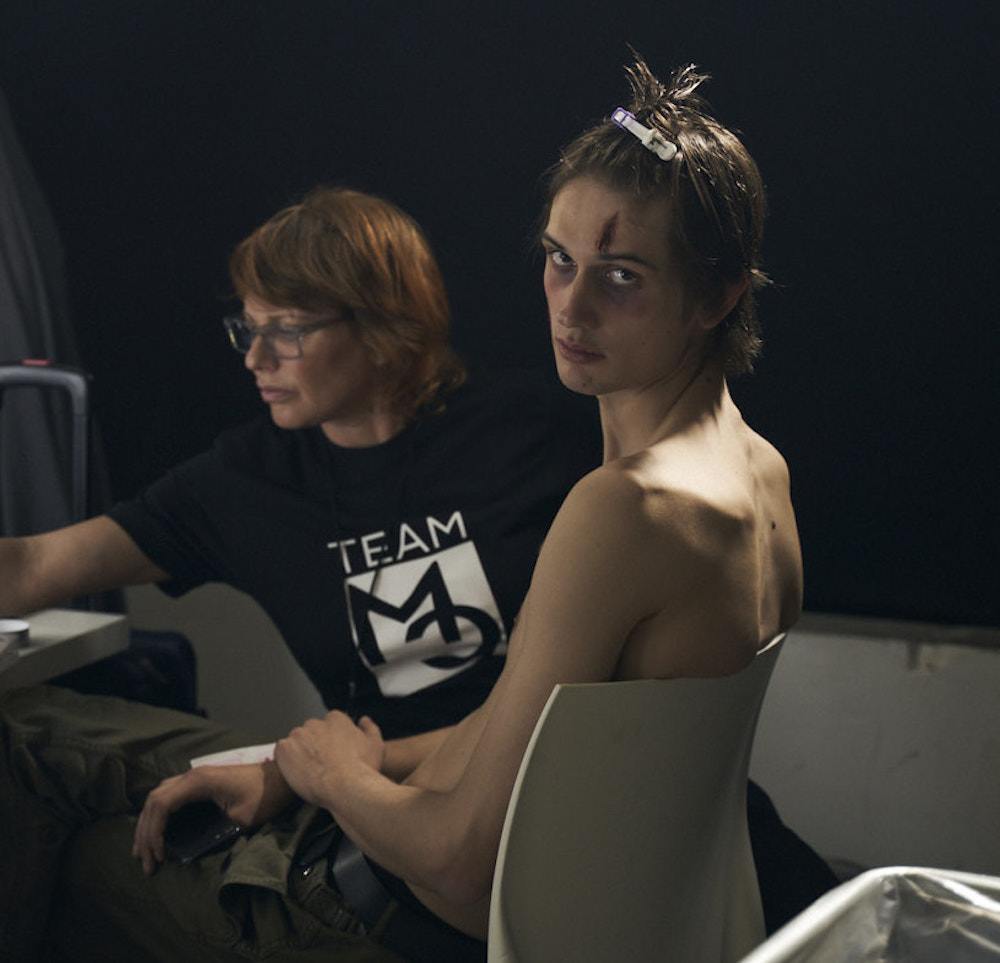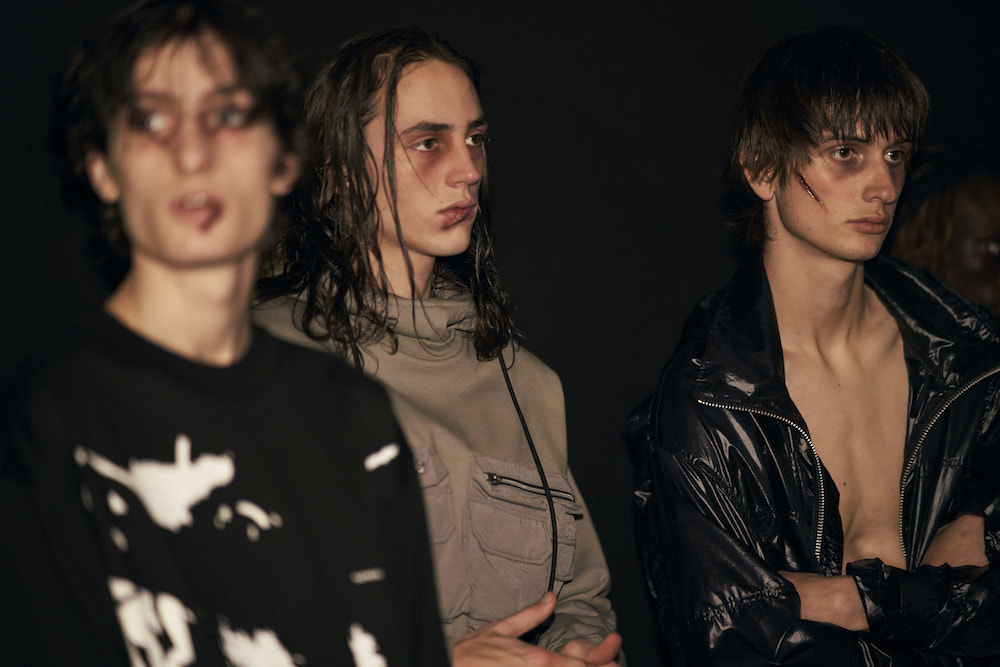 A glimpse of the very few quiet moments behind the scenes in Paris during the Fashion Week mens fall 2020 collections. Capturing the moody moments and expressive eyes, photographer Isabelle Grosse shares a glimpse of the models shot backstage for FashionDailyMag during the grooming + makeup at the Tatras x RiotHill FW 2020 show. Contrasting the rough-around-the-edges and ‘beat up’ tough guy face makeup, the models mood up a pretty sweet face, n’est-ce pas?