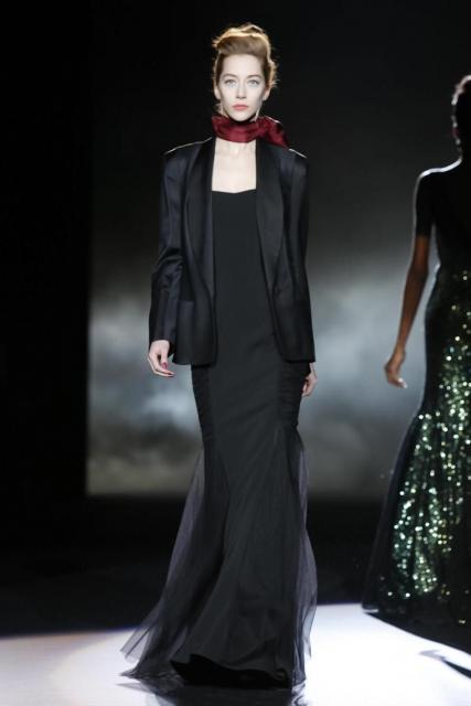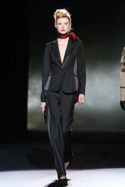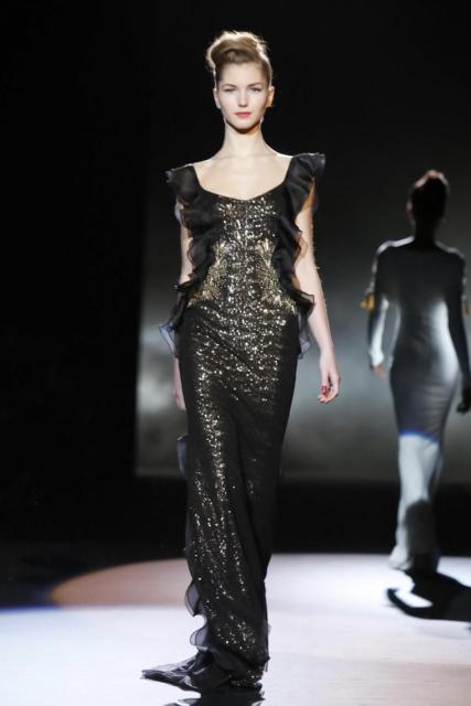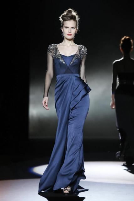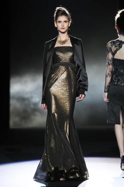 Daytime sophistication with streamlined silhouettes and seasonal suiting textures revealed a down to business influence. The evening shift brought gowns developed for the purpose of drama. With draping that evoked a romantic mystique, décolletage treatments varied with each intended effect. Accentuating with ornamentation at the neck and shoulder added interest, while sheer and lace peeked, and tasselsand bling elements played into an exotic tale of commanding opulence.