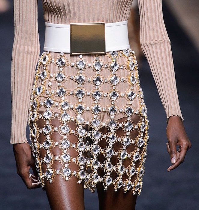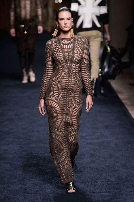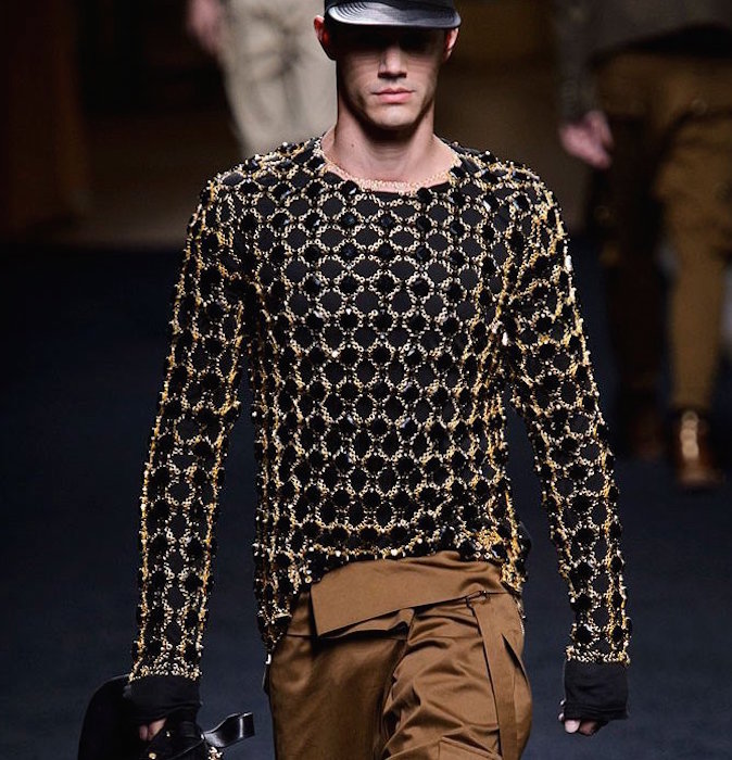 Another season of sexy at Balmain menswear for ss16 shown during Paris Fashion Week. Tight as usual roped skin tight dresses on the girls, and a casual layered with alot of studs for the guys. The Kimye-flavored Olivier Rousteing spiced his + hers pieces were made for a major entrance. Details of crests, bones, gold and chain mail added to the hotness of the looks, on both guys and the girls.