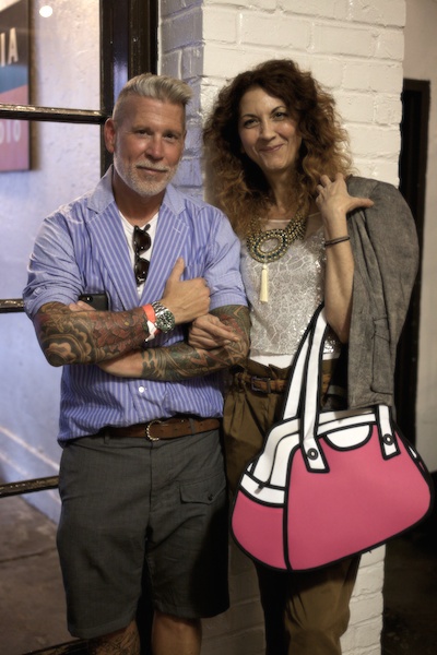 3. Nick Wooster with Brigitte Segura backstage ss15 menswear shows NYMD. top by Stella Nolasco, jewelry by Milanna, bag by JumpFromPaper, photo Photo: Charles Warren | FashionDailyMag