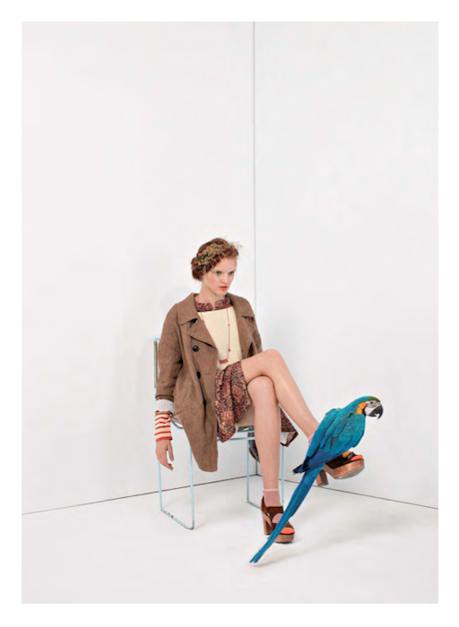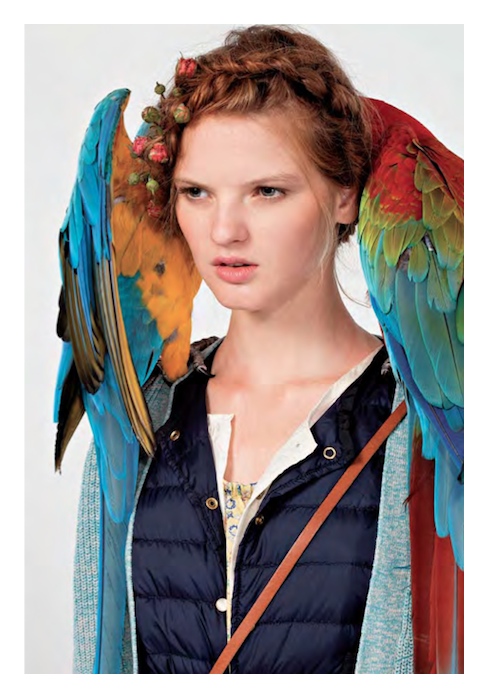 Check out the leg-baring looks that balanced heavy fabrics and dark hues: the likes of lightweight chocolate brown leather tops and shorts. The Bellerose girl is ready to brave the great outdoors with pastels and earth tones providing a soothing contrast to the electrifying effect of the parrot perched on her shoulders (hey, we all want a bird’s-eye view). The shifting approaches to layering showed that she is ready for any situation in her dark paradise. Harkening back to “fragile femininity” motifs within Coppola’s films, we believe Bellerose brawn refuses to be broken.