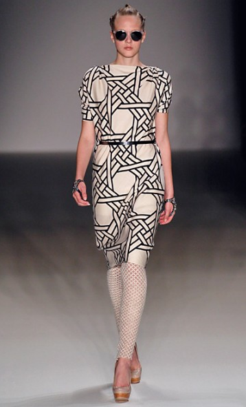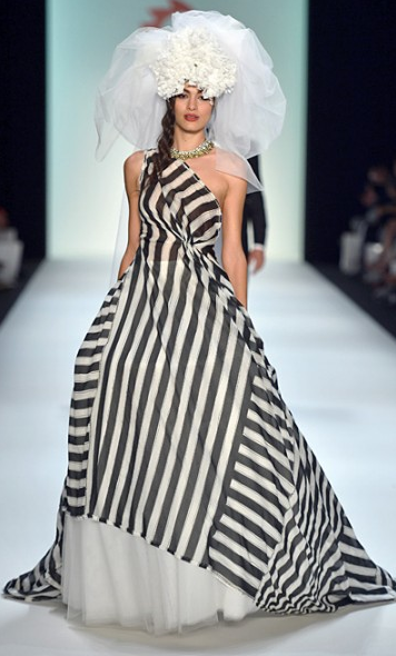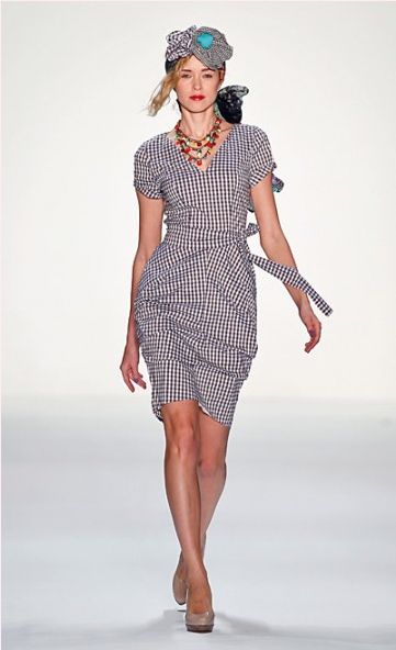 Viva la Gockel with a sassy supply of models strutting with vigor at Anja Gockel. Bold stripes and spirited gingham play nicely with layers of edge. Black and white dominates the scene in a variety of effective combination from small scale to statement makers. Applied red adds punch and multi-colored prints are fitting with just enough sweet. An assortment of hair pieces from scarves to flowers make for an unforgettable feminine playfulness.