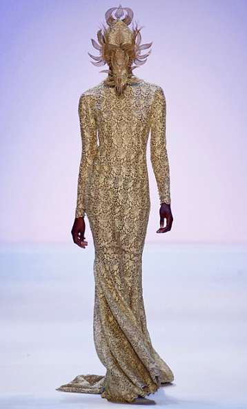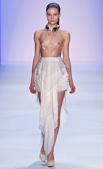 Wearable art takes on a new meaning at Irene Luft. The influence of fine tailoring propels the collection to new heights at every turn. Three dimensional components were cleverly placed to conceal while on display. Masked faces certainly up the ante as do see through moments ranging all the way to clear. It’s more and more obvious to us now more than ever, there is still a wanton for couture contenders.