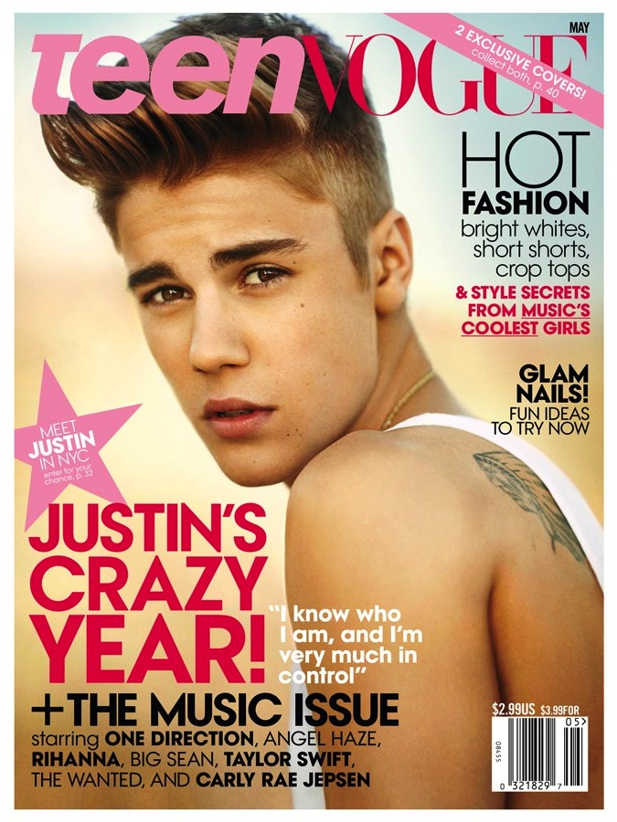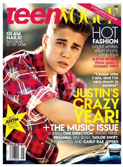 After a busy year, JUSTIN BIEBER has a new a cover- or two. Following TEEN VOGUE‘s success with the December cover featuring boy band One Direction, the BIEBS is covering the MAY music issue. Though his popularity seems flat recently, Bieber‘s recent “erratic behavior in public” may get the teen readers more interested in catching up with the heartthrob. And for your viewing pleasure, the magazine is releasing two covers to newsstands- you have to admit, he looks pretty good. Check him out, and a little BIEBER quote..