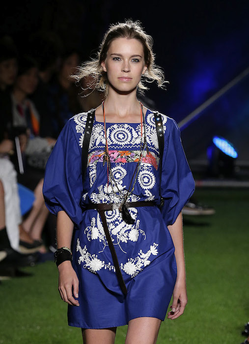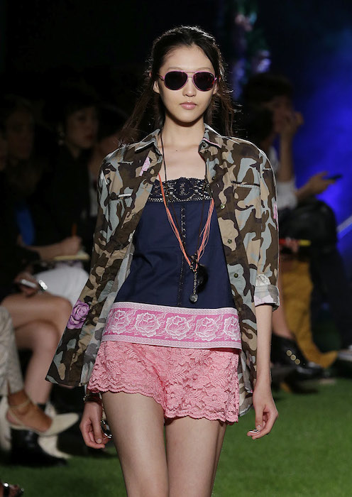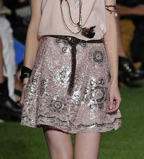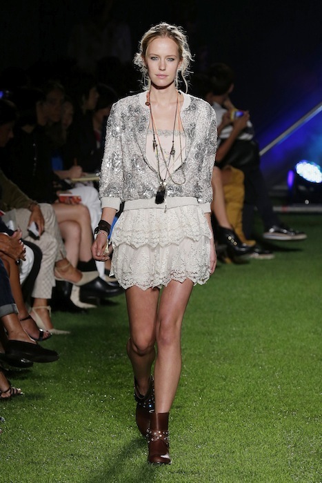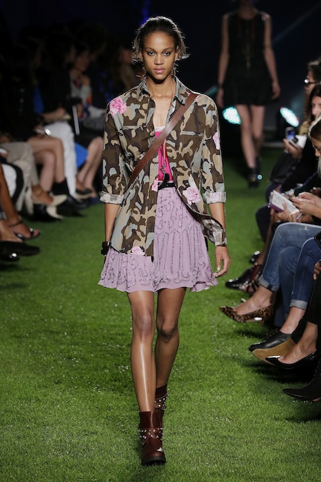 A free energy… dreamy romanticism inspired by music festivals at BLUGIRL ss15 MFW. Fabric mixing of lace and embroidery with some camo come in a free spirited “ROCK en PLEIN AIR” style. Ready to rock and flirt. Wearable pieces including embroidered denim jackets mixed with kaftans, princess dresses, and vintage lace made new and BOHO cool.