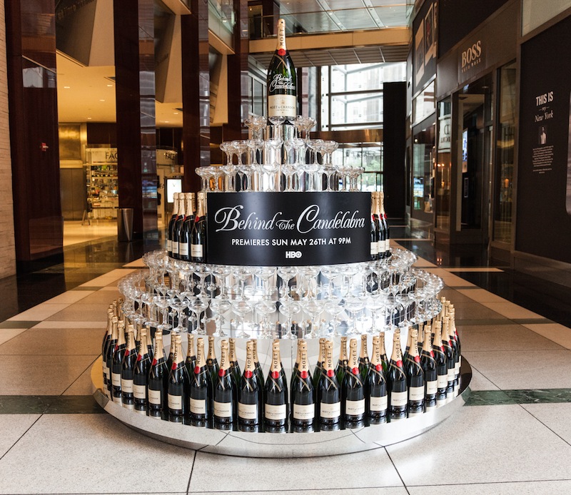 The ‘Champagne of Cinema’ Moet & Chandon also added to the fun, by having a bejeweled Imperial bottle and a breathtaking 12-foot tower composed of 140 bubbling bottles-the more the merrier ! Liberace, whose dramatic performances were equaled only by his dazzling duds, has inspired a fleet of fearless artists-think Madonna, Elvis, Lady Gaga, and even Sir Elton John. Although Liberace’s sequined stage getups have stunned generations, behind all of the glam was a guy who was simply passionate about performing and also his partner Scott Thorson-which is now immortalized in director Steven Soderbergh’s new flick.
