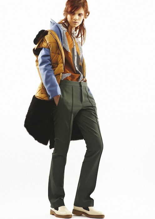 The masculine, sporty trouser seemed to bountiful in the pre-fall collection bouncing from color to color across a wide palette: the colors ranging from scorched coral, metallic blue and musky green down to the darker granites, charcoals and blacks. Color blocking has been a common attribute to Marni collections season after season, and Pre-Fall 2013 was no exception: olive and bordeaux colors complemented the crèmes and were tied together with caviar black lining. The fuzzy outerwear seemed to add a feminine elegance to the sporty boyfriend-fitted collection, brilliantly contouring the masculine aspect, also depicted in the footwear collection.