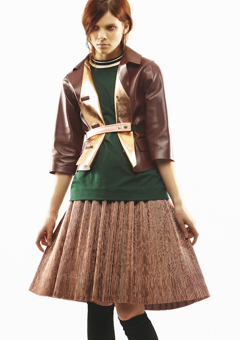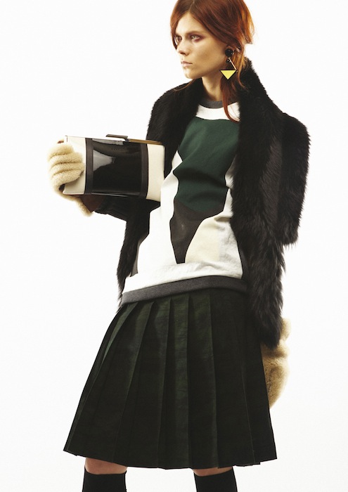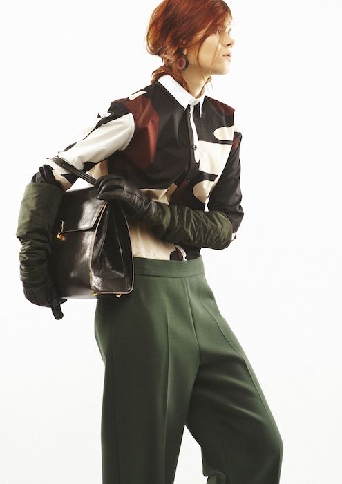 As fall 2013 RTW fashion week nears, we look forward to seeing what edgy appeal designer Consuelo Castiglioni decides to take on her collection, and this season was no exception. Marni winter edition 2013 took a playful approach, throwing the modern woman a masculine curve ball. One of the intriguing impressions pre-fall left us with was the school girl concept: the short-sleeved, pressed, button down had played two roles: one in between collared and the other crew necked, all of course, in traditional uniform colors: black, burgundy, white, and beryl (a deeper navy).