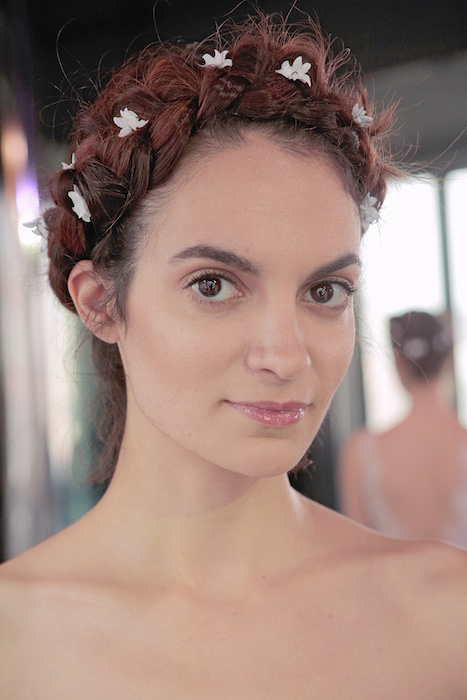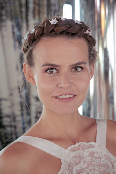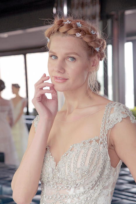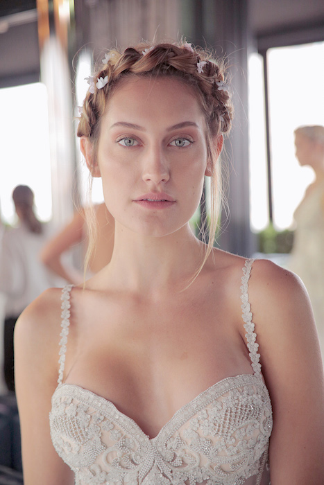 Sweet braids and delicate flowers adorn the hair ever so delicately, keeping the eyes on the intricate lace + details of each dress.