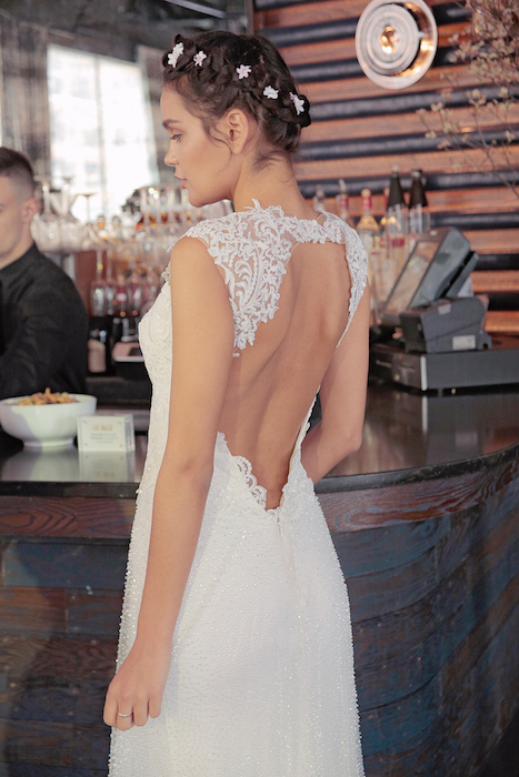 Here comes the bride in lace at Gemy Maalouf for spring 2018. Pretty details of intricate lace fuse with ultra detailed bodices with embellishment. Feminine with a throwback to another era, Maalouf creates light and airy gowns made for a romantic girl at heart. Modest in silhouettes, the Gemy Maalouf bride doesn’t need a train the length of an aisle to celebrate her big day.