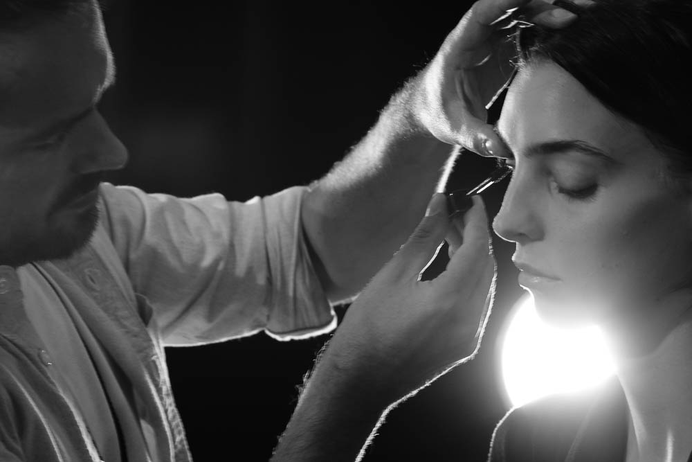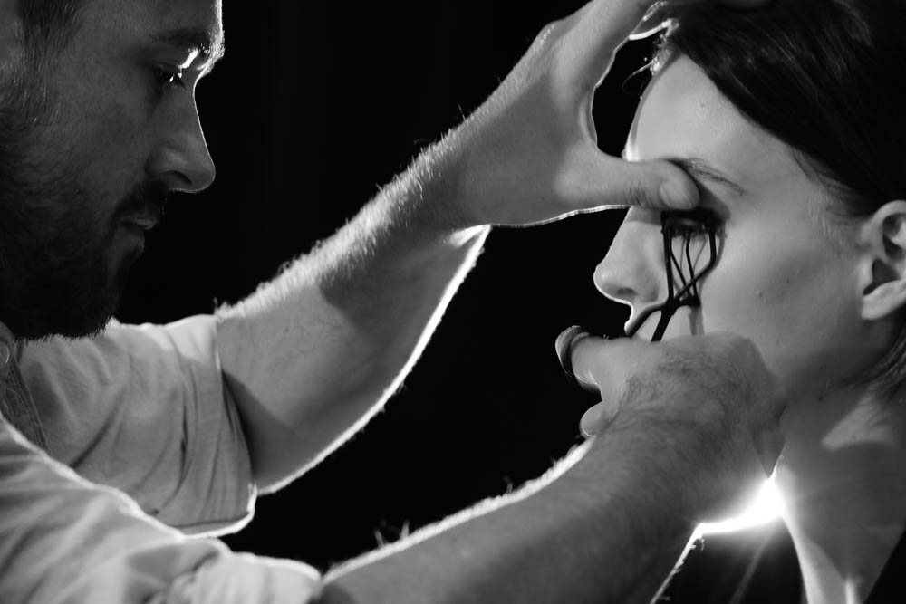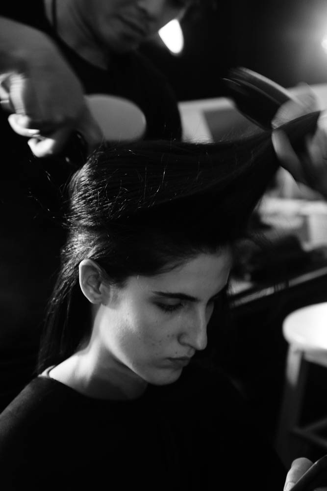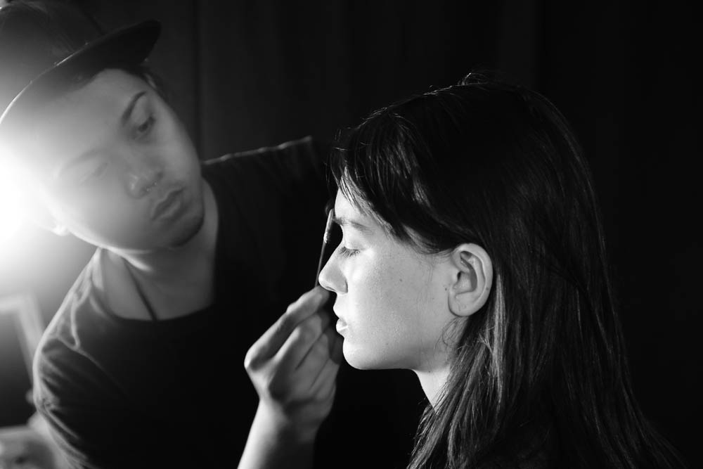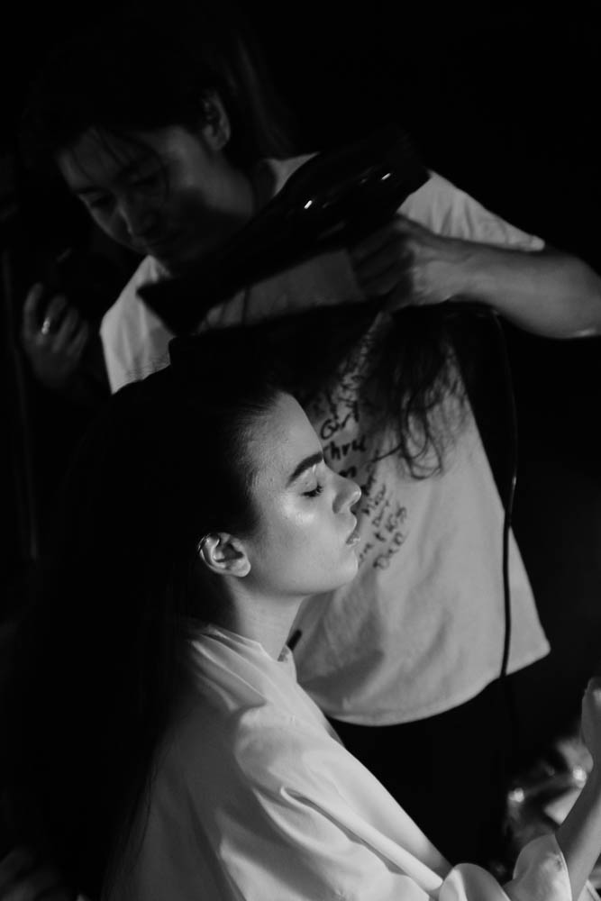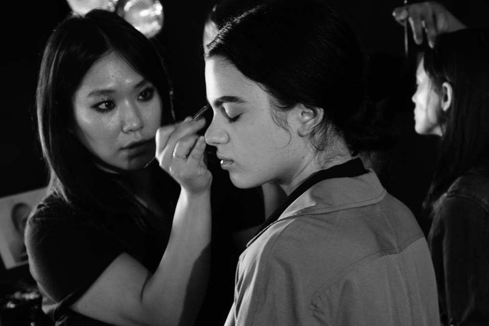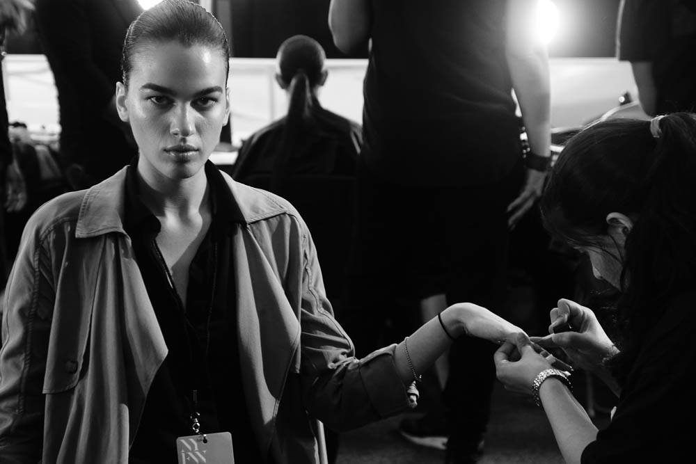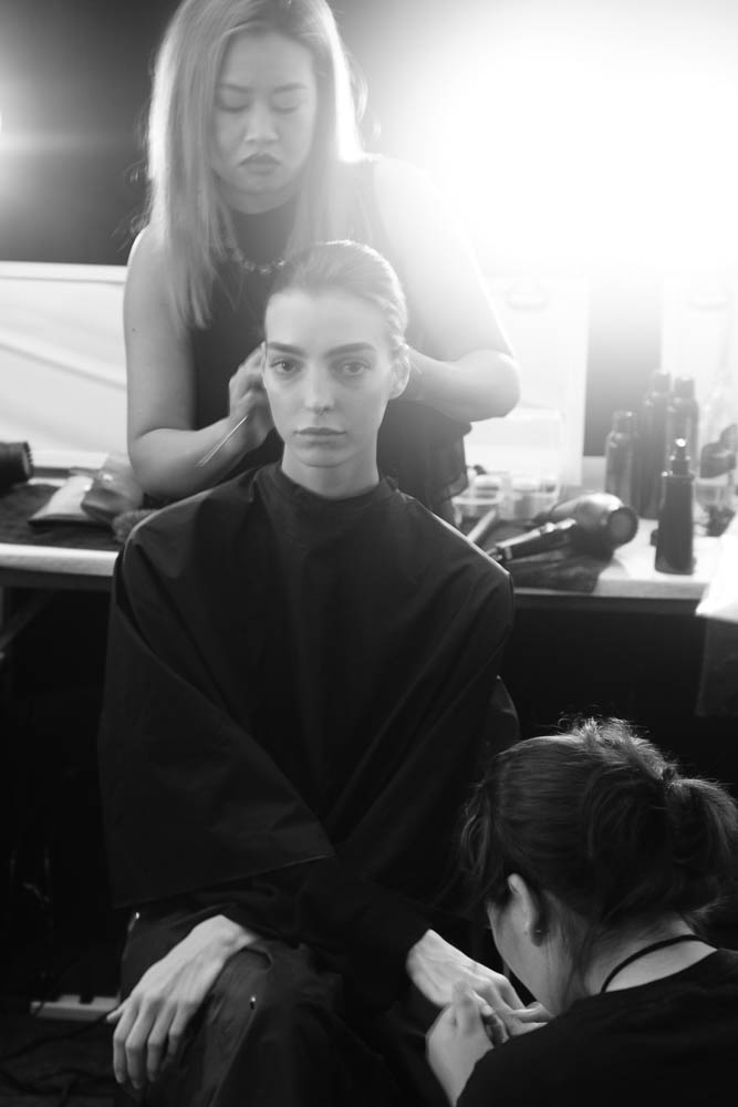 A serene yet fashionably energized vibe backstage at the LIE SANG BONG spring 2016 show during NYFW. A behind the scenes FashionDailyMag exclusive view captured in black and white by Angus Smythe. The makeup artistry, the models, the set design, and the designer. Here’s a moody view of what we loved.