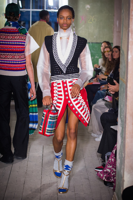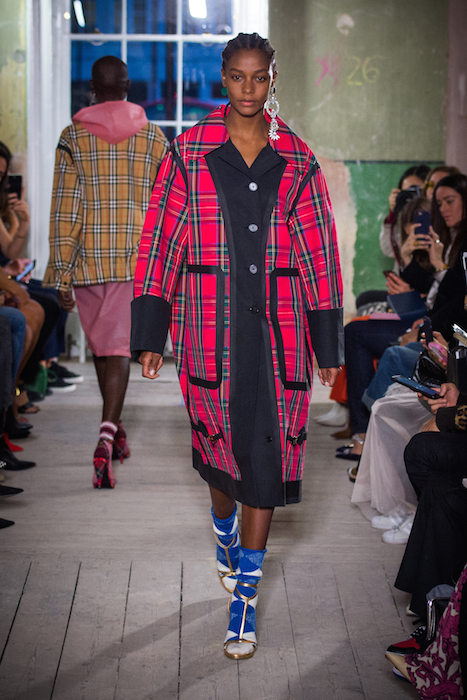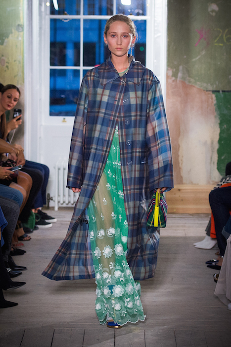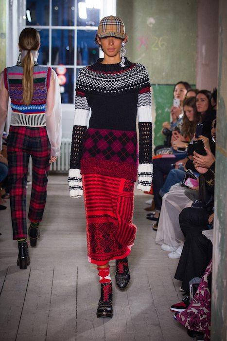 A “clash of textures, colors and silhouettes” was the theme presented, with British knits over lace gowns, tartan and plastic, jackets reworked into skirts, and socks with everything. Some winter sorbet shades of pink, green and blue mingled with black, camel, red and navy in a mashup Tartan and Vintage checked wools, and Fair Isle and Argyle knits, Plastic, and Faux fur.