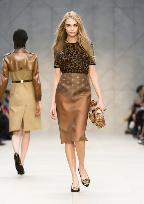 Mixing the Brit attitude of Christine Keeler with the iconic Burberry looks resulted in a successful formula for Bailey, since he inserted a liveliness to the darker fall season. Guys got into the fun too, as a heart print button-down interjected lightness. Bailey slowly guided us into the hot hues, by first starting with subtle translucent tans that were broken up with hearts underneath the see-through pencil skirts for girls and tailored trousers for guys. But guys didn’t get all the merriment, as an animal print jacket and a gold trench let the gals combine their inner wild child with the city-chic. Never forgetting functionality, the oxblood glossy jacket will be a fresh closet staple for many, while the the animal print- sleeved trench coats will be swinging on the streets across London for all you showstoppers.