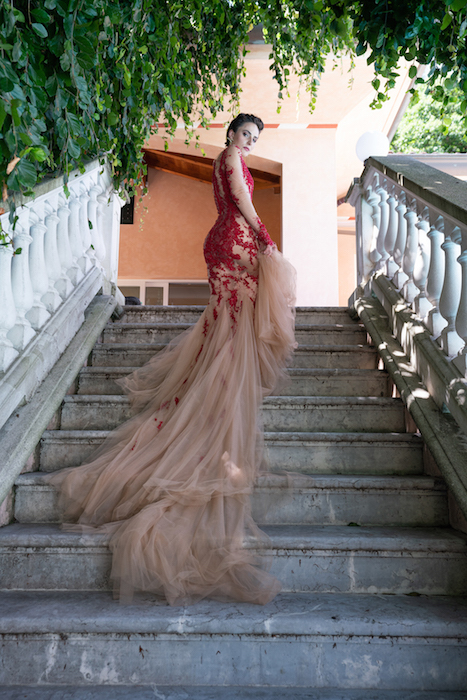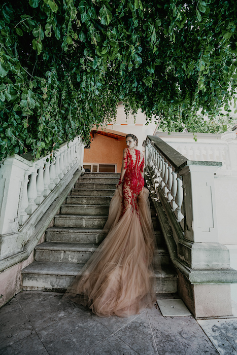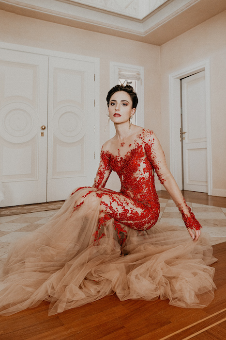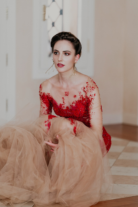 Red Gown with Red Crystal Accents and embroidery with train: Ines di Santo; Shoes: Camila; Hair Accessory: Renee Pawele Bride; Earrings: Decolove.