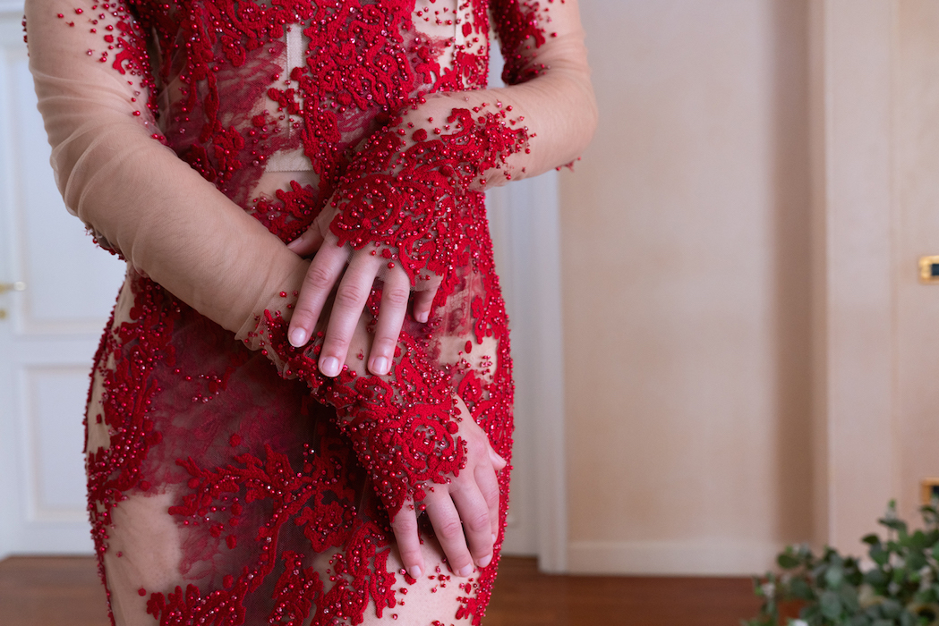 Red Ruffled Gown: La Metamorphose Couture; Shoes: Ziad Nakad, Earrings by Swarovski.