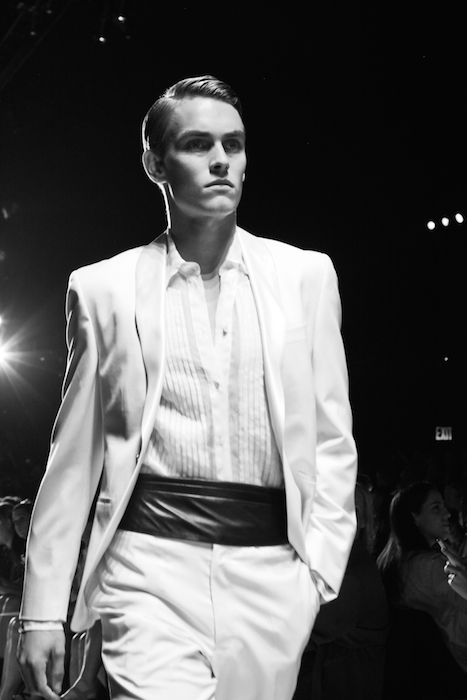 No fifties look would be complete without pleats and embroidery, and Carmen Marc Valvo kept his collection playful and modern with metallics, mesh, florals, and cut-outs. As if that wasn’t refreshing enough, these looks were not limited to women’s style but included menswear as well. Floral tuxedo jackets and sheer button up shirts graced the runway in this collection… we’d like to call the men the womens’ best accessories.