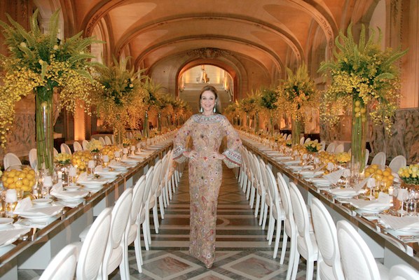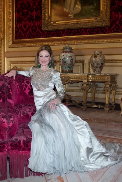 B: My gown was one of the last twelve designed by Alexander McQueen before he died. The earrings are jade and diamond from Fred Leighton; a gift from my husband after I received the ‘Legion of Honor’ last spring.